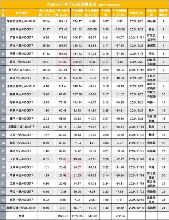截至7月10日,全市场38只中证A500ETF规模合计达1985.44亿元,较年初的2577.35亿元已下滑591.91亿元。