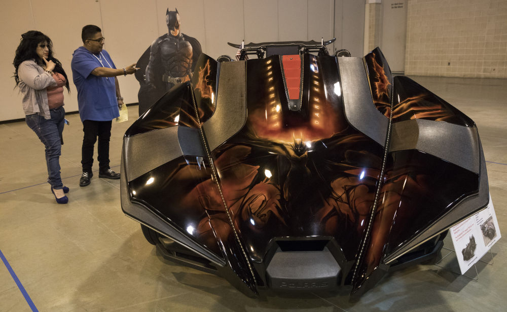 2019年7月28日,在美国得克萨斯州休斯敦,人们观赏一辆以蝙蝠侠题材电影《黑暗骑士》为主题的“北极星弹弓”定制车。新华社发(李怡今摄)