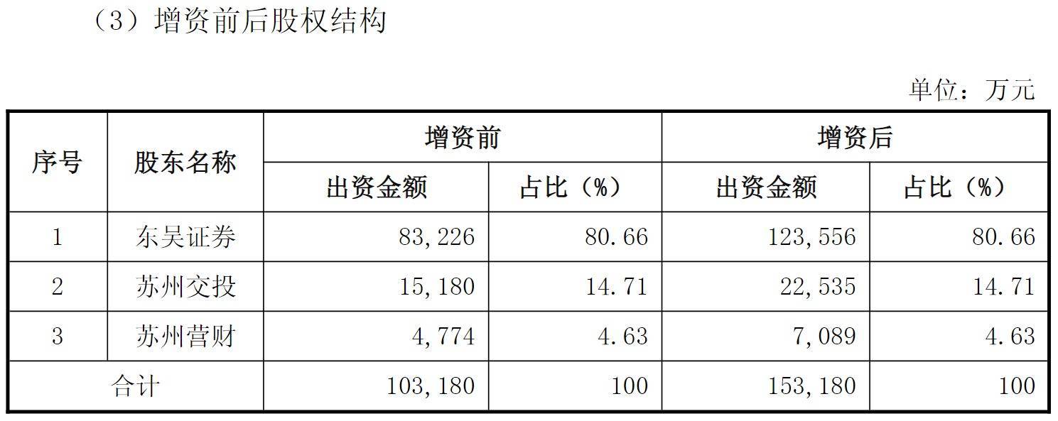 具体出资安排上,5亿元新增注册资本由三位股东按各自原有持股比例认购。其中,东吴证券出资约4.03亿元,苏州交投出资7355万元,苏州营财出资2315万元。增资完成后,东吴期货的注册资本将从10.32亿元增至15.32亿元,三位股东的持股比例保持不变。