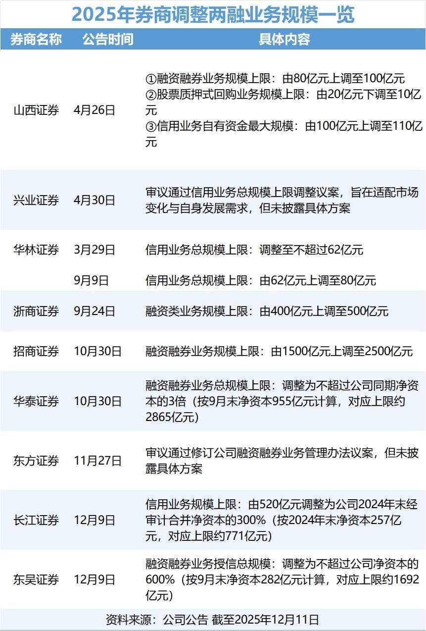 据不完全统计,2025年内,已有9家券商通过上调业务规模上限、调整授信管理模式等方式优化两融业务布局,包括东吴证券、长江证券、东方证券、华泰证券、招商证券、华林证券、山西证券、兴业证券、浙商证券。